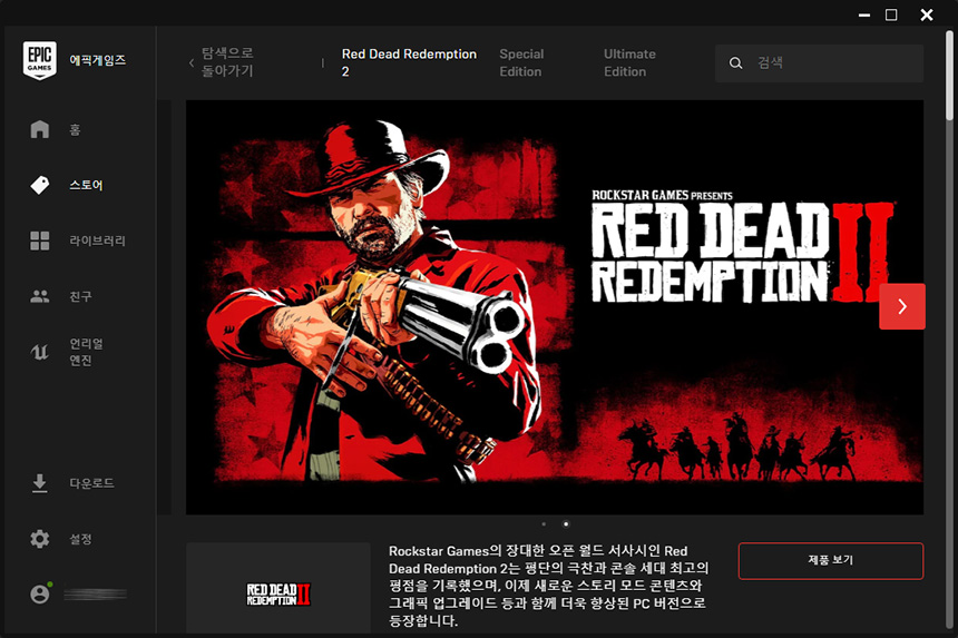 레드 데드 리뎀션 2는 GTA 시리즈로 유명한 락스타 스튜디오의 작품입니다. 20주년 기념 작품답게 최고 수준의 게임이라는 평가를 받고 있습니다. 그리고 가격은 44,220원입니다. 참고로 GTA5도 할인을 하고 있지만 예전에 무료로 배포한 적이 있어서 메리트는 없을 것 같습니다.