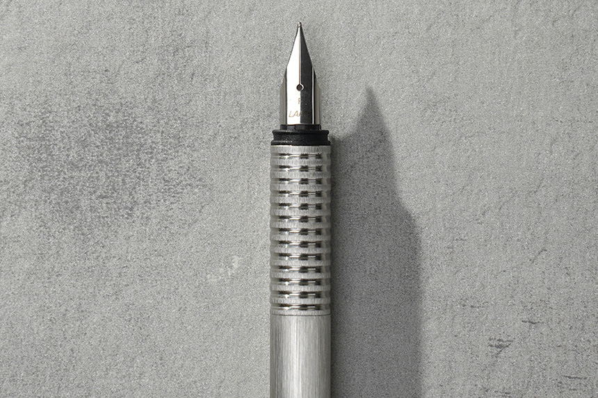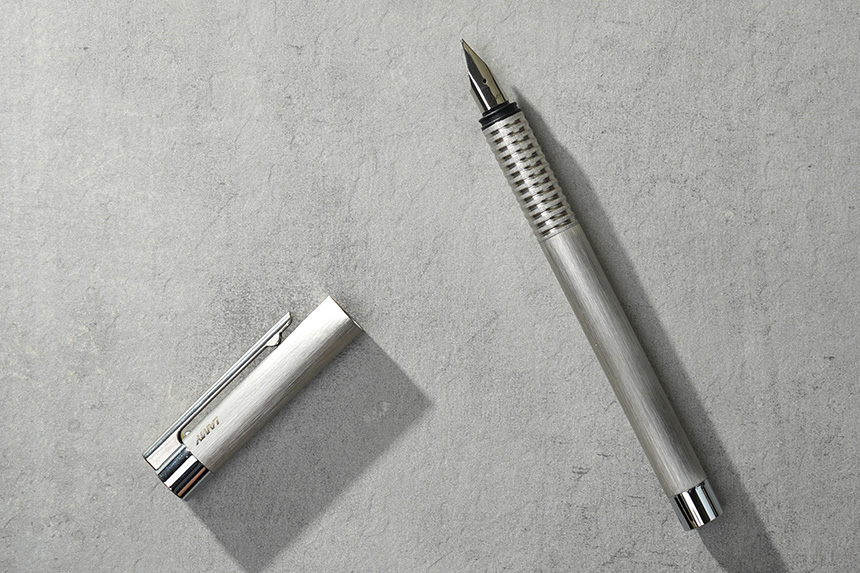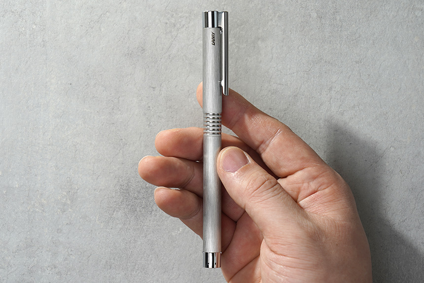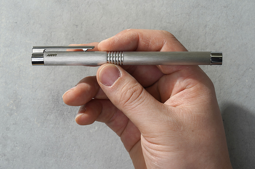 라미 만년필은 브러쉬드 스테인리스 스틸 재질로 제작되었습니다. 특히 헤어 라인이 들어가 있는 모습이 인상적이지만 실제로 사용해보면 엄청 고급스럽고 그런 느낌은 아닙니다.