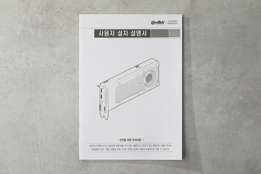 이엠텍 RTX 3070 블랙 에디션의 구성품을 살펴보면 사용자 설치 설명서가 한 장 포함되어 있습니다. 그런데 공용이라서 그런지 파운더스 에디션(FE)의 모습이 인쇄되어 있습니다. 처음 설치하는 분들은 한 번 확인해 보시길 바랍니다.