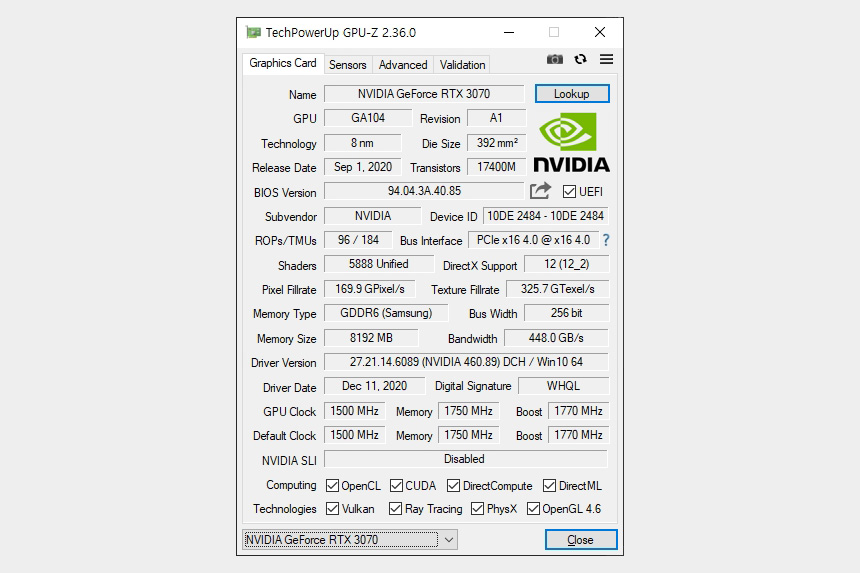 이엠텍 RTX 3070 블랙 에디션은 5888개의 CUDA 코어를 가지고 있고 베이스 클럭은 1500MHz 부스트 클럭은 1770MHz입니다. 그리고 레이 트레이싱과 같은 다양한 기술을 지원합니다.