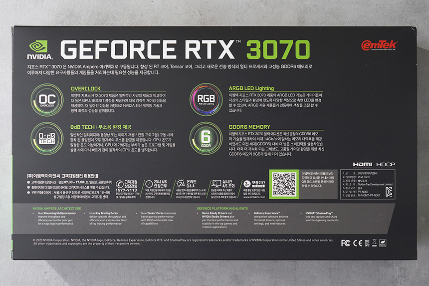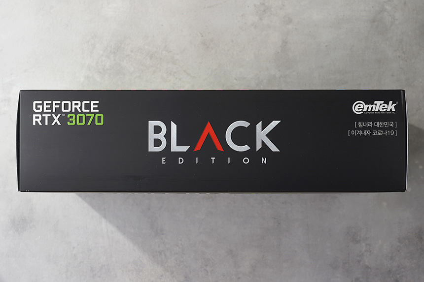 이엠텍 RTX 3070 블랙 에디션의 박스는 세련된 형태로 제작되었습니다. 그리고 주요 특징이 설명되어 있는데요. 오버클럭 버전이고 8GB 메모리를 탑재했습니다. 그 외에도 게이밍 기어의 필수 요소라고 할 수 있는 RGB LED를 내장하고 있습니다.