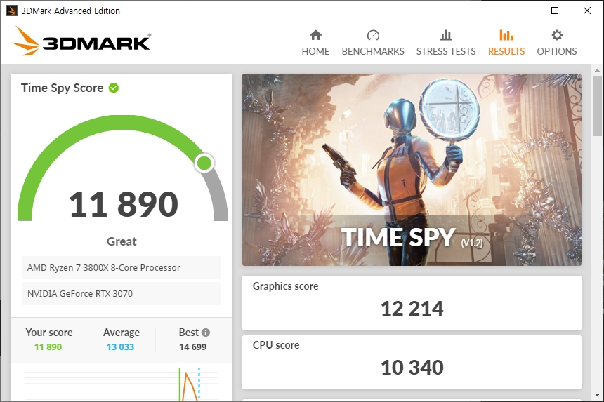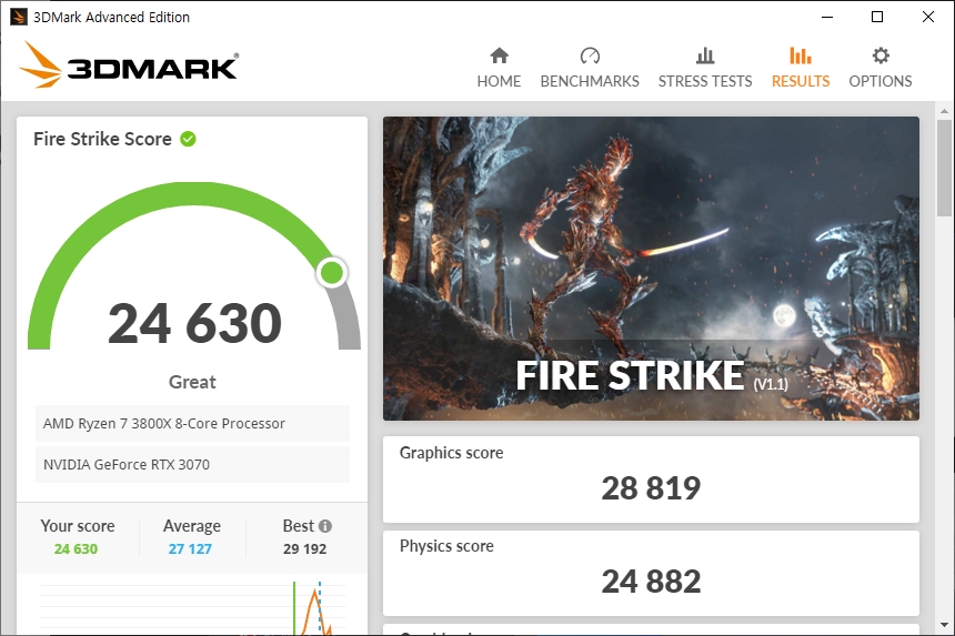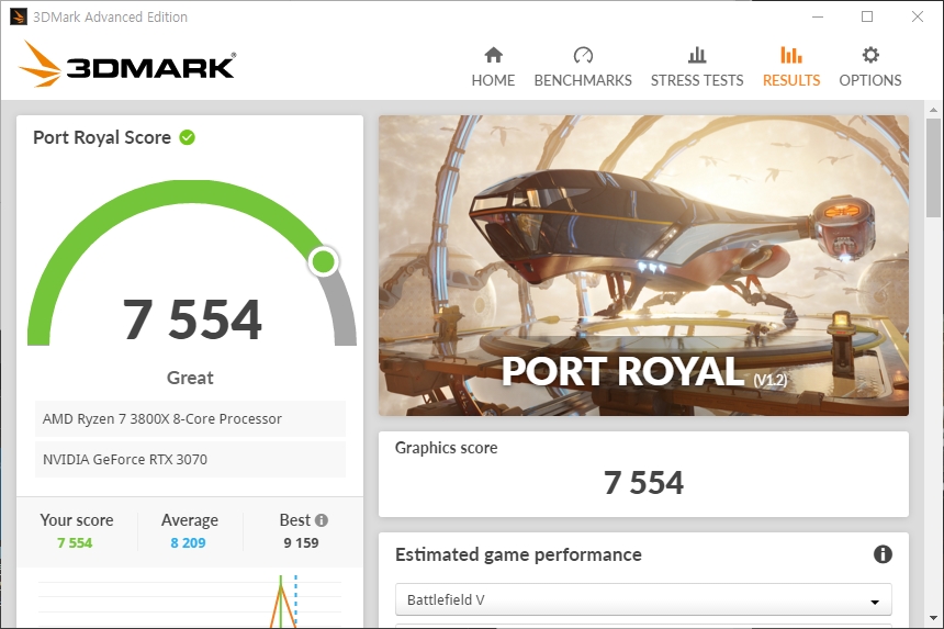 이엠텍 RTX 3070 블랙 에디션의 성능을 확인해 보면 3DMARK 파이어 스트라이크는 28819점 타임 스파이는 12214점 그리고 포트 로얄은 7554점이 측정되었습니다. 뛰어나지는 않지만 무난한 편이라고 할 수 있습니다.