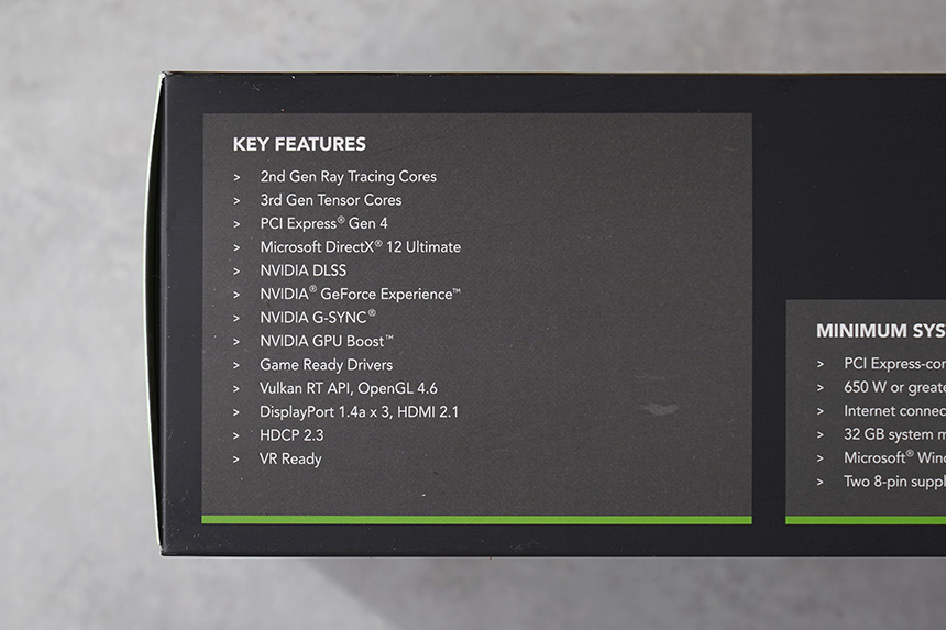 박스의 옆면을 살펴보면 핵심 특징이 설명되어 있습니다. 우선 2세대 레이 트레이싱 코어와 NVIDIA DLSS 등의 기술이 탑재되었습니다. 그리고 제가 구매한 이유는 HDMI 2.1을 지원하기 때문입니다.