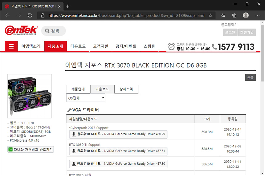 제가 구매한 이엠텍 RTX 3070 블랙 에디션은 현재 카드할인이나 쿠폰 등을 잘 활용하면 60만원대 초반에 구매를 할 수 있습니다. 비슷한 수준의 제품들도 크게 다르지 않은 가격들이 책정되어 있고 3000번대 그래픽 카드는 완성도가 상당히 높다는 평가를 받고 있으니 새롭게 컴퓨터를 조립해야 하는 분들이라면 이번 기회에 한 번 장만해 보시길 바랍니다.