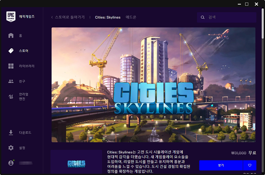 첫 번째 게임은 시티즈: 스카이라인입니다. 재미있는 게임 이기는 하지만 엄청난 수준의 DLC가 필요하므로 조금은 애매한 퀄리티의 작품이라고 할 수 있습니다. 그래도 라이브러리는 채워 놓는 것이 좋을 것 같습니다.