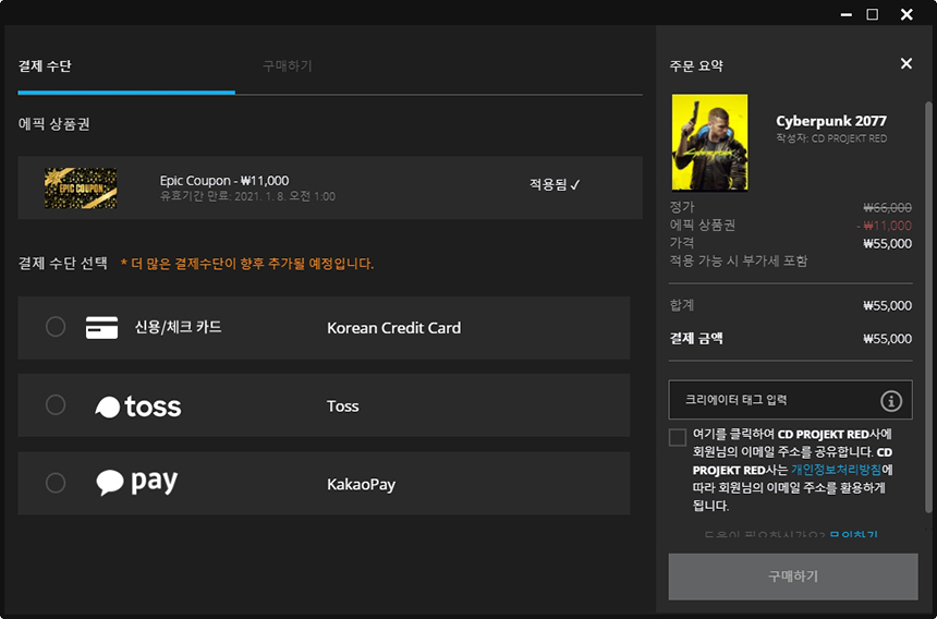 그래서 최근에 인기 있는 사이버펑크 2077에 적용해 보면 55,000원에 구매할 수 있는 것을 확인할 수 있습니다. 최신 게임이라서 거의 할인 혜택이 제공되지 않는데 조금이나마 구매 부담을 줄일 수 있습니다.