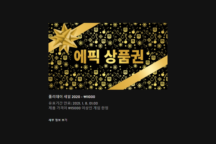 그런데 에픽게임즈에서는 이번 홀리데이 세일 기간에 11,000원짜리 에픽 상품권을 무료로 제공하고 있습니다. 유효기간 만료는 2021년 01월 08일까지로 아직 여유가 있는 편입니다.
