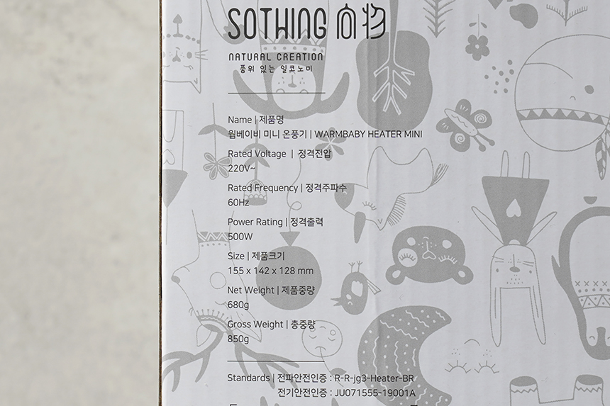 위쪽에는 소싱 웜베이비 미니 온풍기 시즌2를 사용할 때 과열이 되는 것을 방지하기 위해서 위쪽에 무언가를 덮어놓지 말라는 문구도 표시되어 있습니다. 사용할 때 주의해주어야 할 것 같습니다.