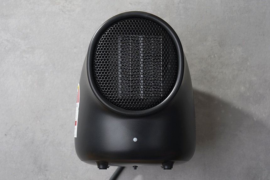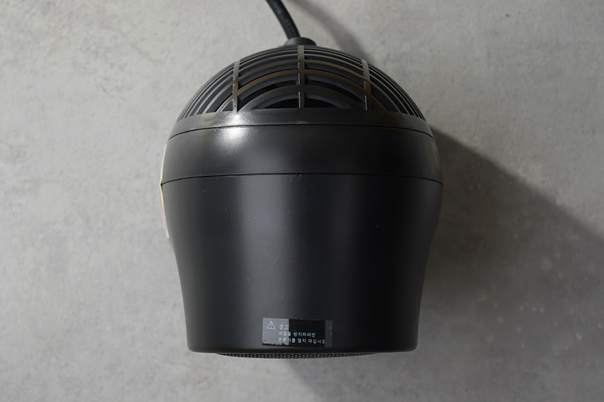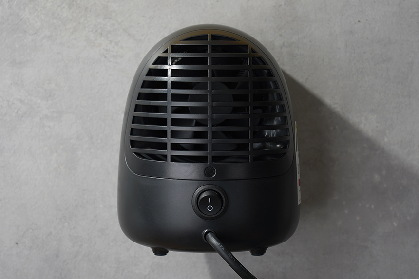 뒤쪽을 살펴보면 전원 버튼이 배치되어 있습니다. 그리고 후면 보호망을 자세하게 살펴보면 내부에 팬이 장착되어 있어서 온풍을 앞쪽으로 보내주는 역할을 합니다.