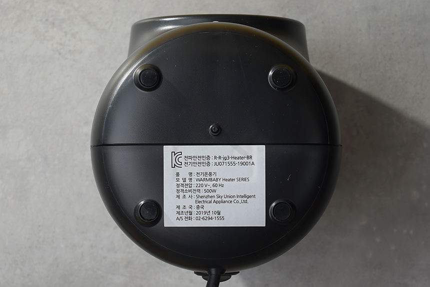 바닥을 살펴보면 중국에서 제조되었고 AS를 받을 수 있는 02-6294-1555 전화번호도 표시되어 있습니다. 특히 전기안전인증 관련 번호도 표시되어 있으니 한 번 확인해 보시길 바랍니다.