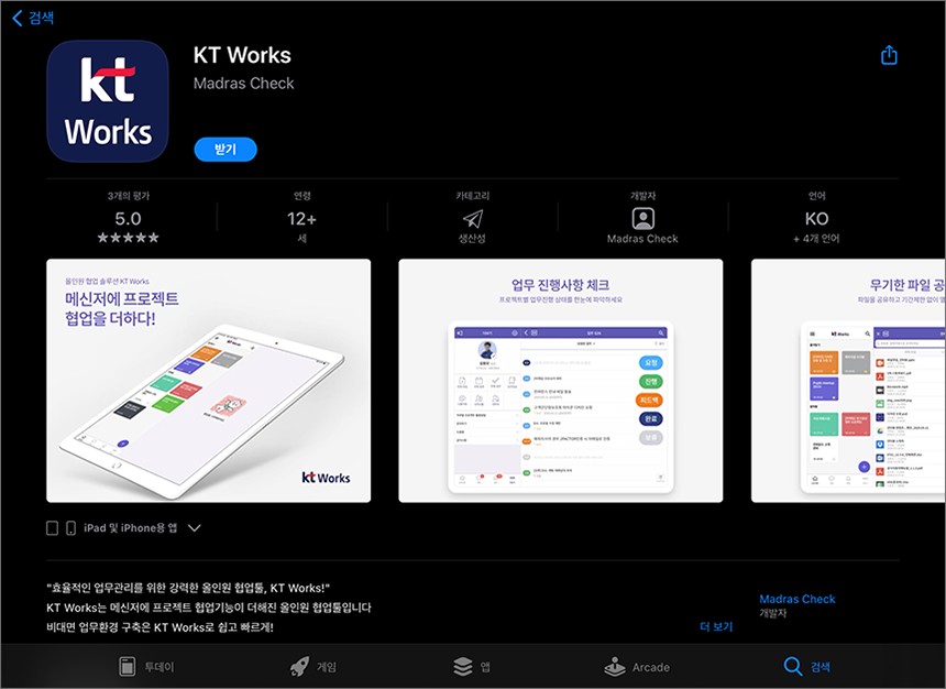 애플 앱스토어에서 KT Works를 검색하면 바로 설치할 수 있습니다. 그리고 개발사는 마드라스체크입니다. KT에서는 다양한 협력사들과 협업을 통해서 솔루션을 개발하고 있습니다.