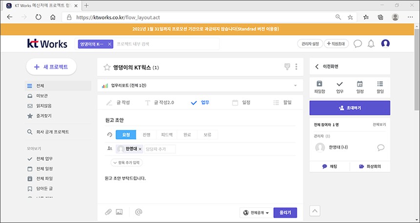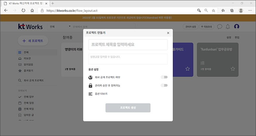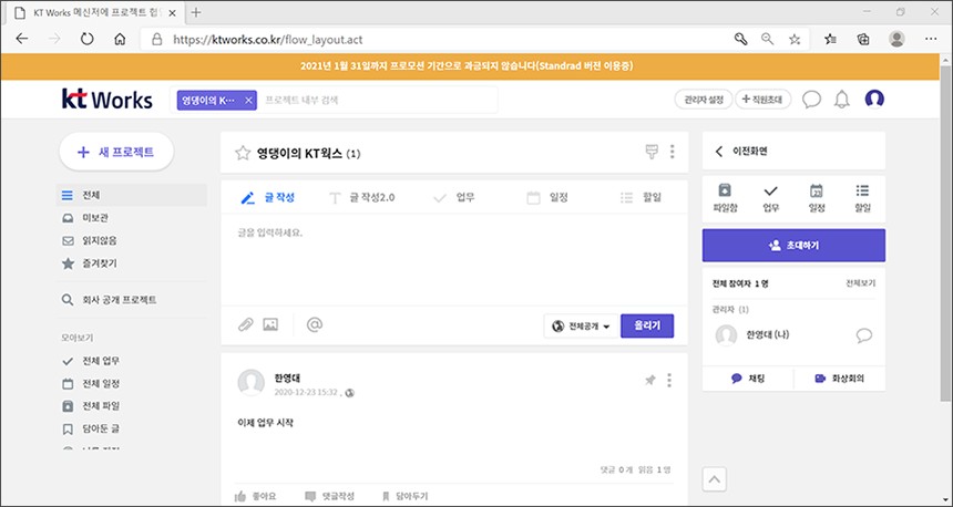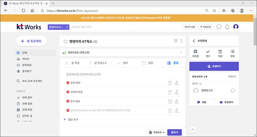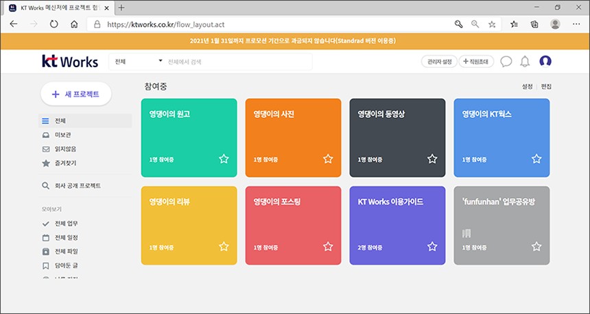 KT Works는 현재 프로모션 기간이라서 과금이 되지는 않고 나중에 1인당 매월 7,000원(부가가치세 별도)이라는 금액으로 이용할 수 있습니다. 참고로 Standard 요금제는 프로젝트 개설 무제한, 저장공간 500GB 그리고 전용 도메인 제공 등의 혜택이 포함되어 있습니다.