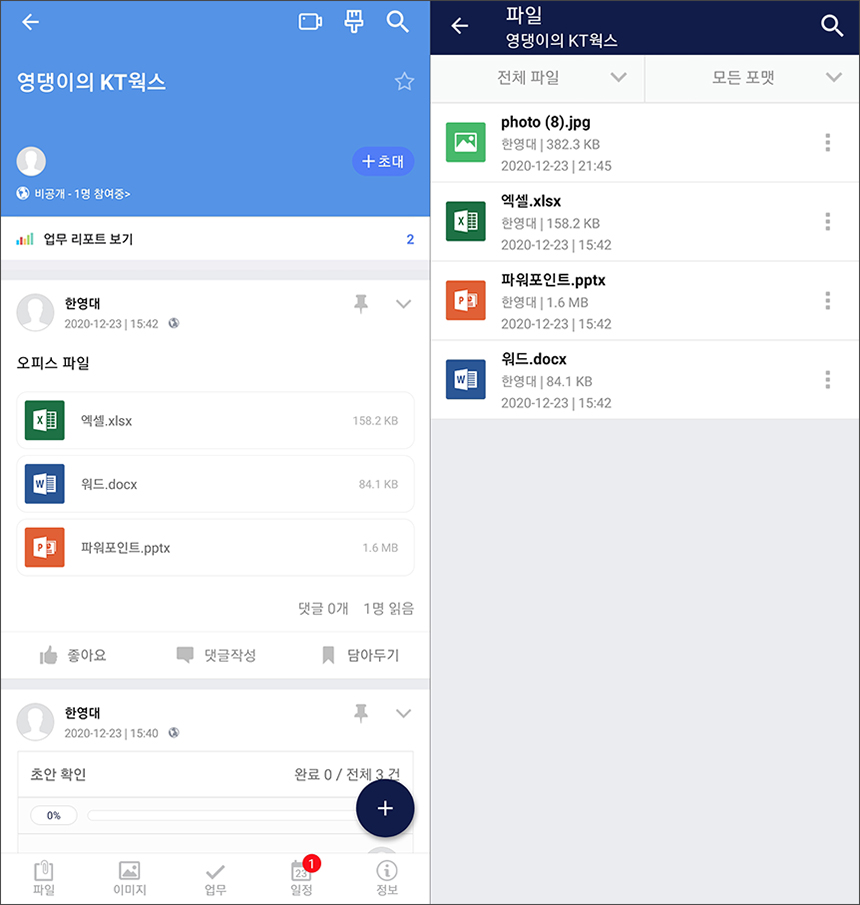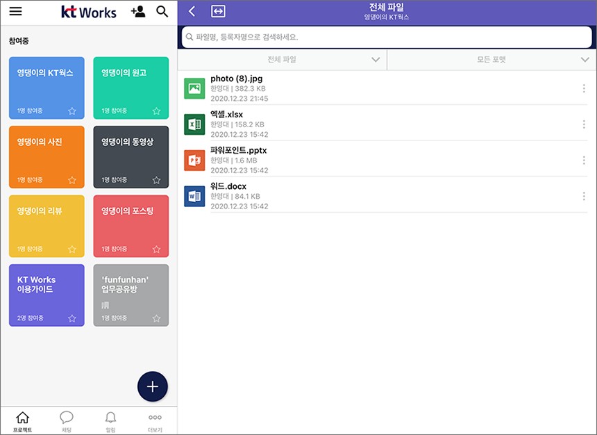 개별 프로젝트를 선택하면 게시물들도 데스크톱과 같이 실시간으로 확인할 수 있고 문서 파일들도 별도로 관리할 수 있습니다. 그리고 파일이 많을 때는 포맷의 종류별로 파일들을 표시할 수 있습니다.