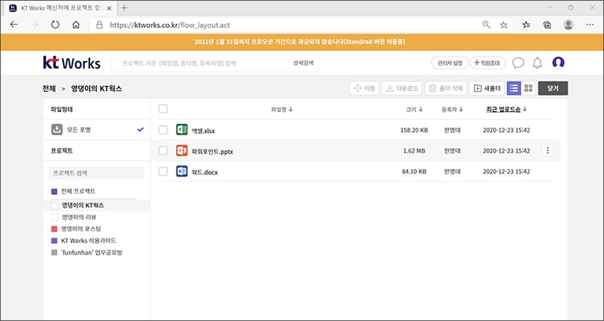 오른쪽에 배치된 메뉴를 이용하면 KT 웍스에 저장된 파일들의 리스트를 확인할 수 있습니다. 특히 KT는 오랜 시간 동안 클라우드 서비스를 운영한 경험이 있어서 파일을 안전하게 보관할 수 있습니다. 그리고 Standard 요금제는 500GB의 파일 저장공간(1회 업로드 500MB)을 제공합니다.