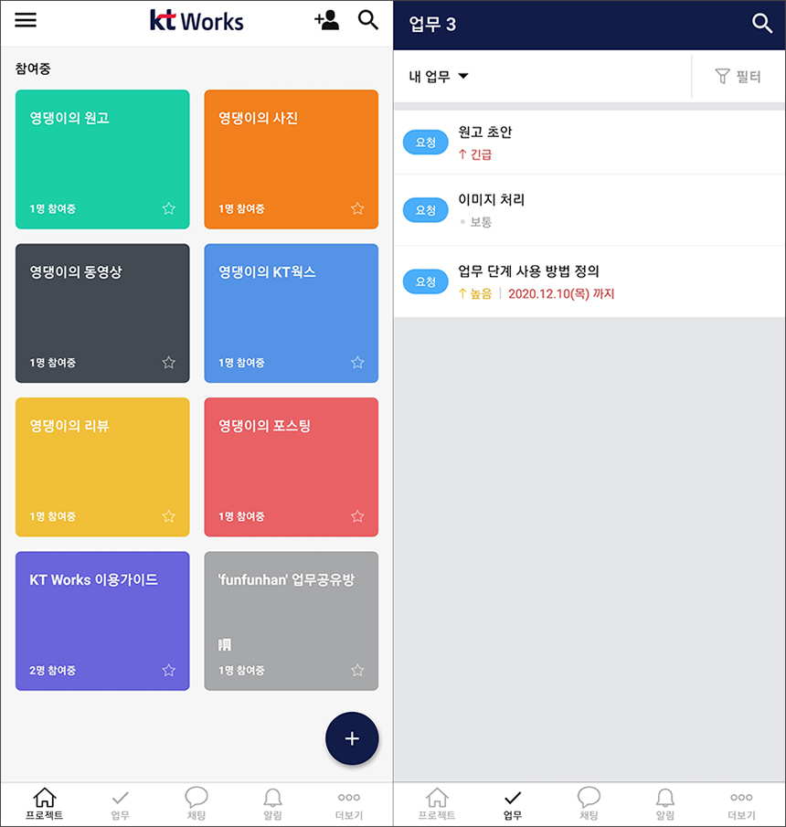 KT 웍스 앱의 메인 페이지에서는 현재 참여하고 있는 프로젝트의 리스트와 업무들도 확인할 수 있습니다. 참고로 표시되는 프로젝트의 색상도 설정에서 변경할 수 있습니다.