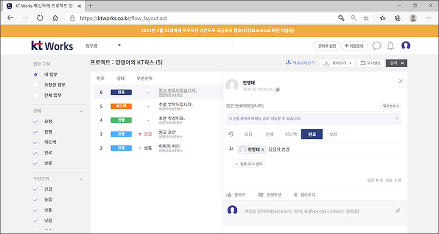 업무는 요청, 진행, 피드백, 완료, 보류 5단계를 통해서 진행 상황을 일목요연하게 확인해 볼 수 있다는 점도 편리한 부분입니다. 특히 담장자나 시작과 마감 일시 그리고 우선순위까지 표시해줄 수 있습니다.