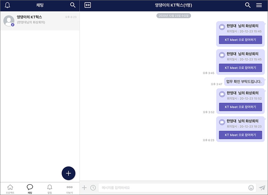 KT Works의 편리한 부분 중의 하나는 메신저 기능을 빌트인 했다는 점입니다. 그래서 사생활과 업무용 메신저를 분리할 수 있습니다. 직장인들에게 정말 유용한 기능입니다. 그 외에도 데스크탑이나 회상회의 앱도 다운로드 받아서 설치할 수 있습니다.