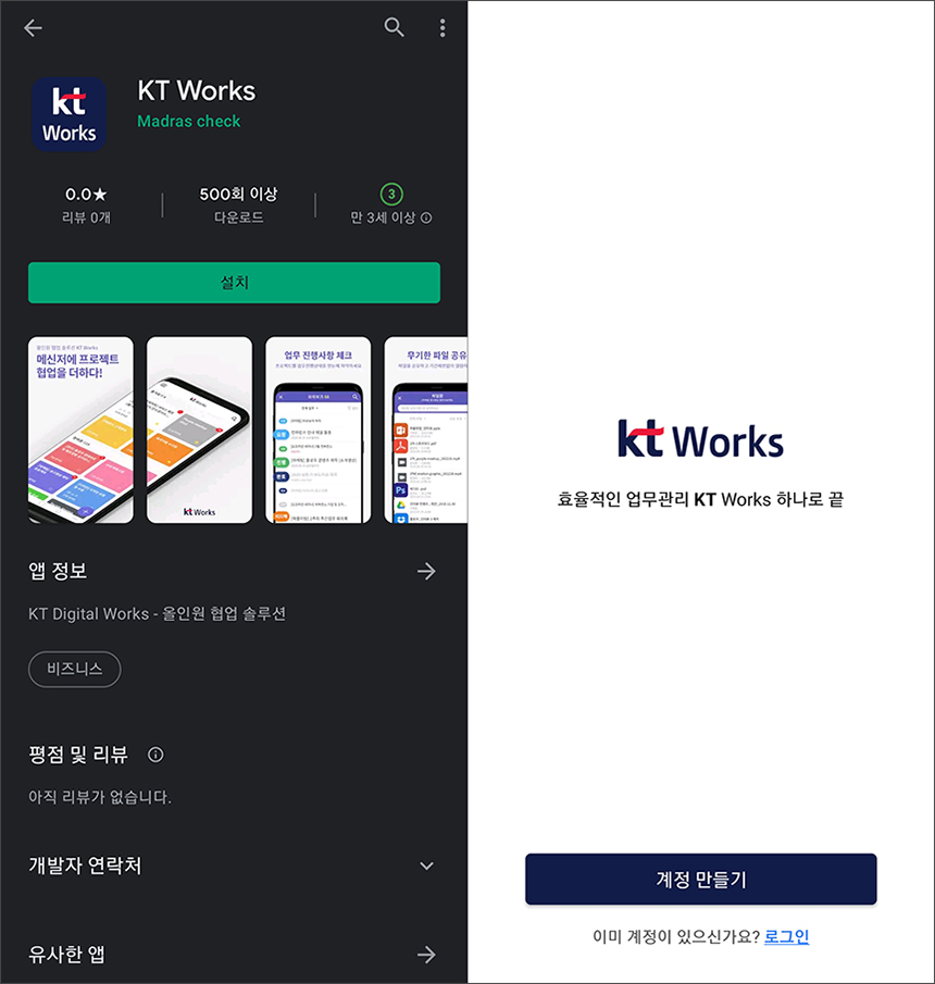 안드로이드 스마트폰 기준으로 서명을 하면 우선 구글 앱스토어에서 KT Works를 검색한 후에 설치해주면 됩니다. 그리고 KT 웍스에 가입할 때 사용한 이메일과 암호를 통해서 로그인할 수 있습니다.