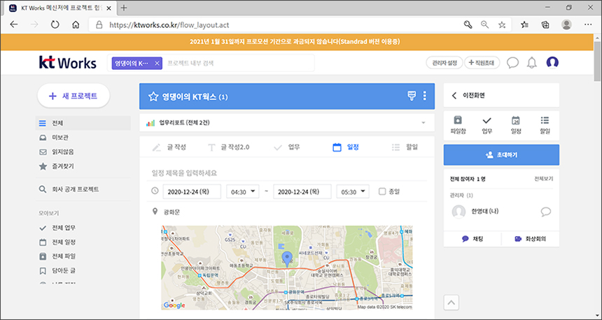 일정 메뉴에서는 날짜와 장소의 지도 그리고 화상회의 등의 기능을 추가할 수 있습니다. 여러 팀원에게 일일이 따로 공지하지 않고 한 번에 공유할 수 있다는 점이 편리한 부분입니다.