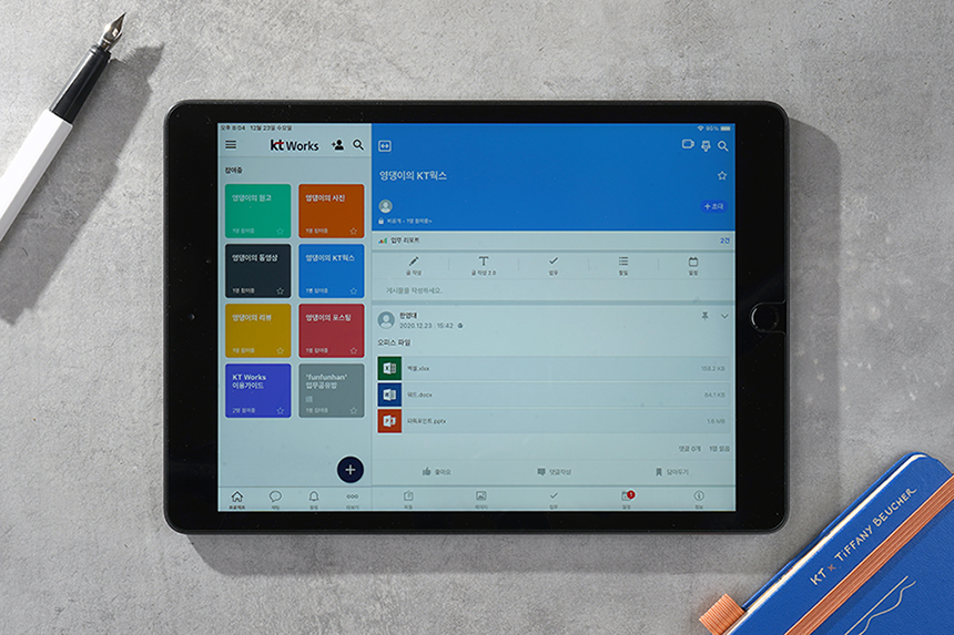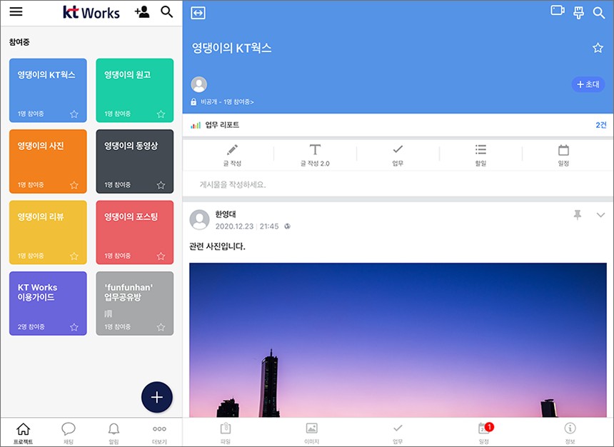 태블릿에서 KT 웍스를 실행시키면 스마트폰과는 다르게 큰 화면에서 프로젝트나 게시물들을 확인할 수 있습니다. 별도의 키보드만 있으면 간단한 업무처리는 충분히 가능해 보입니다.