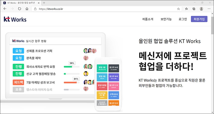 KT 웍스는 아래쪽에 있는 홈페이지 주소를 통해서 접속할 수 있습니다. 그리고 주요 특징들이 설명되어 있는데요. 프로젝트를 중심으로 자사 직원은 물론이고 협력사와도 협업할 수 있도록 설계되었습니다.