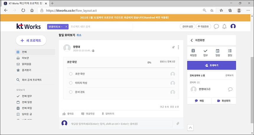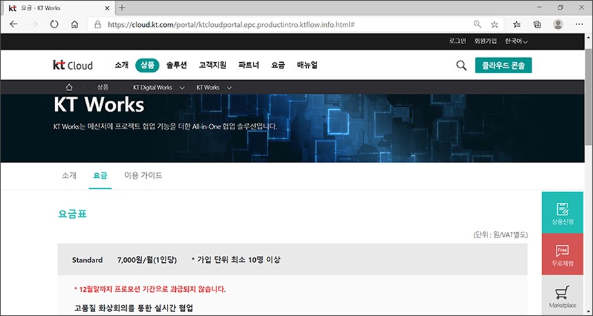 KT Works는 현재 프로모션 기간이라서 과금이 되지는 않고 나중에 1인당 매월 7,000원(부가가치세 별도)이라는 금액으로 이용할 수 있습니다. 참고로 Standard 요금제는 프로젝트 개설 무제한, 저장공간 500GB 그리고 전용 도메인 제공 등의 혜택이 포함되어 있습니다.