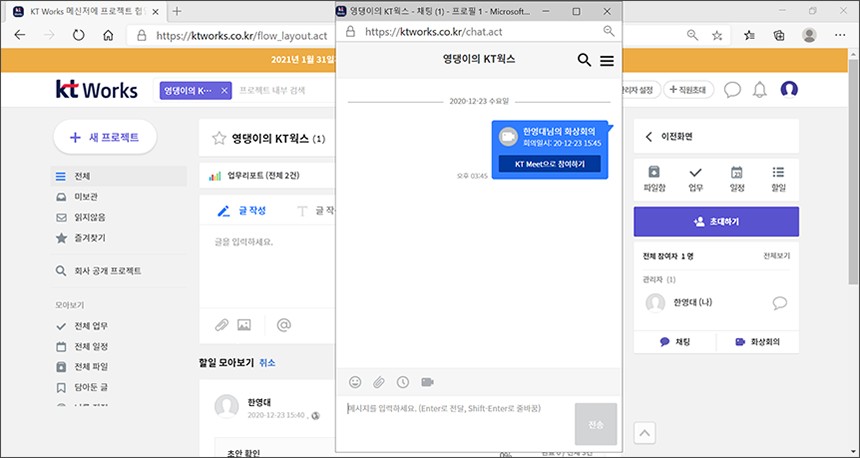 KT Works의 편리한 부분 중의 하나는 메신저 기능을 빌트인 했다는 점입니다. 그래서 사생활과 업무용 메신저를 분리할 수 있습니다. 직장인들에게 정말 유용한 기능입니다. 그 외에도 데스크탑이나 회상회의 앱도 다운로드 받아서 설치할 수 있습니다.