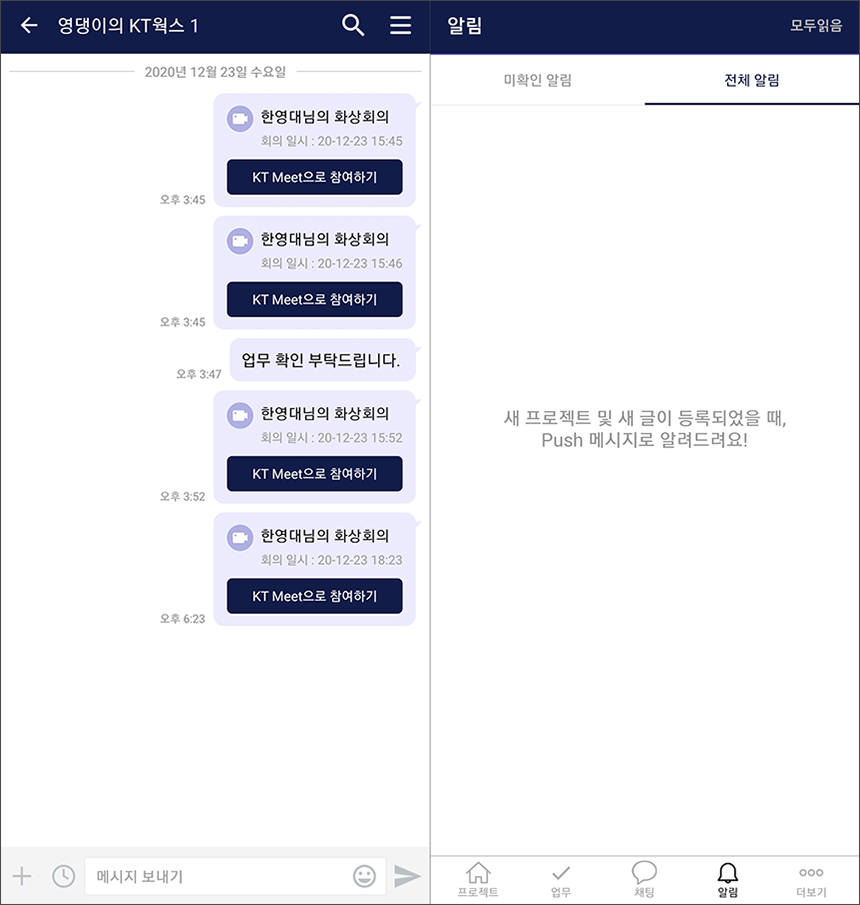 KT 웍스의 편리한 부분 중의 하나는 다양한 플랫폼을 지원한다는 점입니다. 특히 스마트폰 앱도 완성도가 높은 편이어서 데스크톱과 유사한 사용 환경에서 업무를 처리할 수 있습니다.
