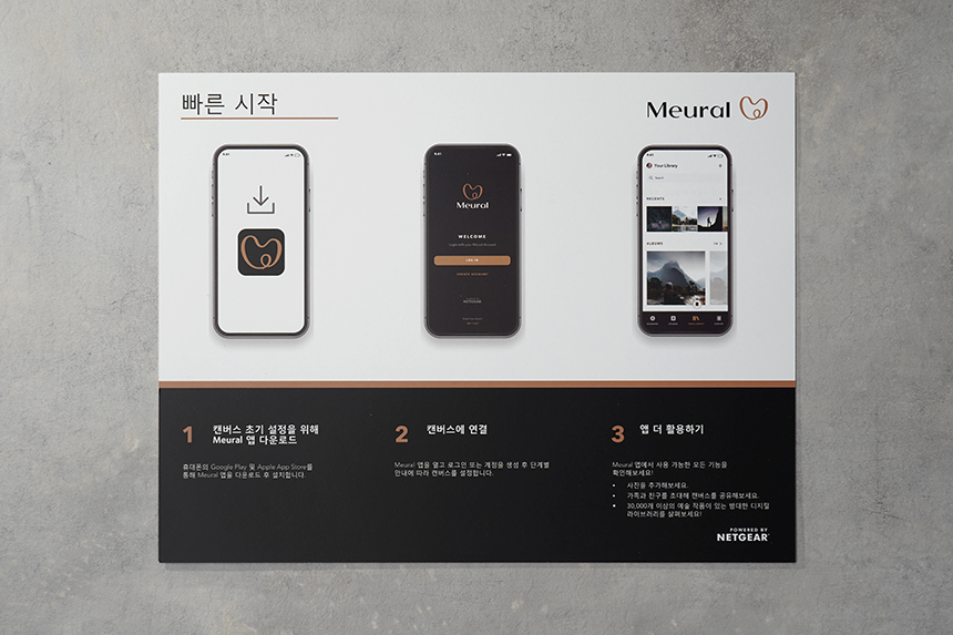 구성품을 살펴보면 빠른 시작 가이드가 한 장 포함되어 있습니다. Meural 앱을 다운로드하고 넷기어 뮤럴 MC315 디지털 액자를 설치하는 방법들이 설명되어 있으니 한 번 정도 읽어 보는 것이 좋을 것 같습니다.