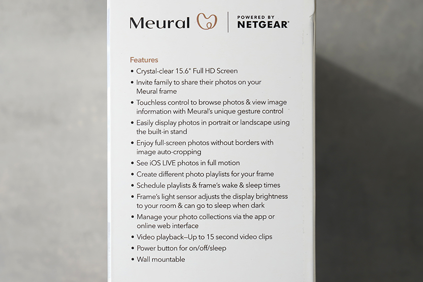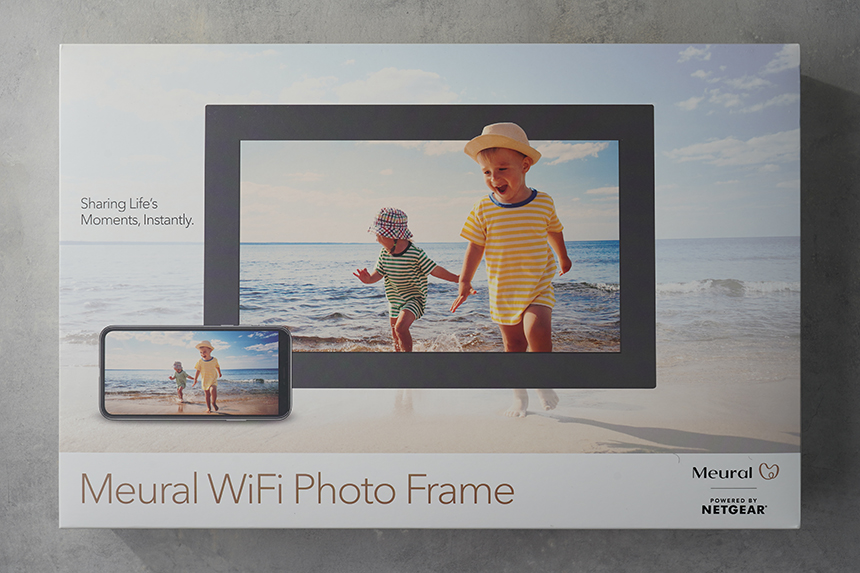 넷기어 뮤럴 MC315 디지털 액자의 박스는 깔끔한 형태로 제작되었습니다. 그리고 스마트폰과 연동해서 다양한 사진들을 전송할 수 있는 내용의 일러스트가 인쇄되어 있습니다.