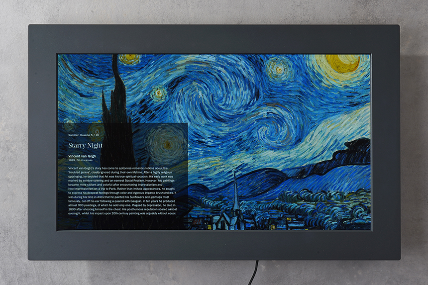 넷기어 뮤럴 MC315 디지털 액자는 명화나 자신이 촬영한 사진들을 선명한 화면으로 감상할 수 있습니다. 그리고 주변 광 센서가 탑재되어 있어서 주변 밝기에 맞게 조도가 자동으로 조절됩니다.