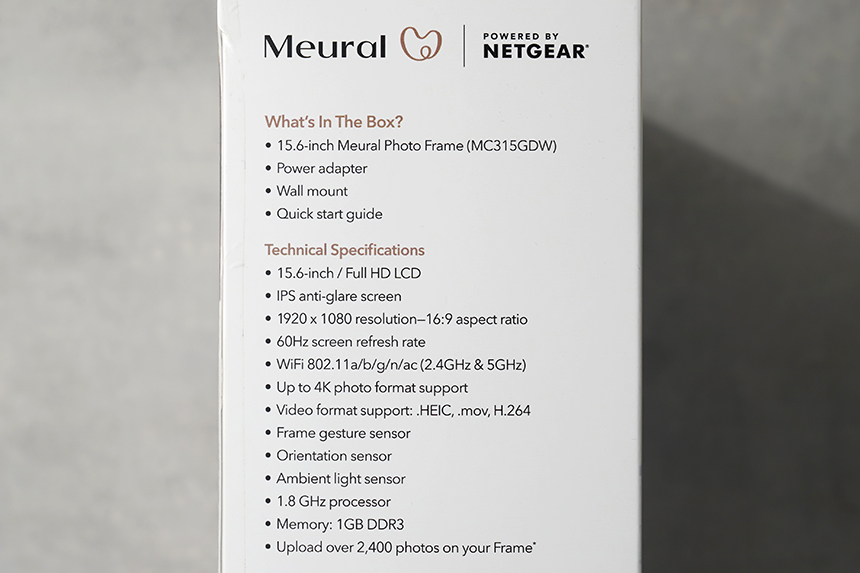 박스의 옆면을 살펴보면 넷기어 뮤럴 MC315 디지털 액자의 구성품과 함께 스펙이 표시되어 있습니다. 1.8GHz의 프로세서와 1GB의 DDR3 메모리를 탑재했고 4GB 용량의 클라우드를 기본 제공합니다.
