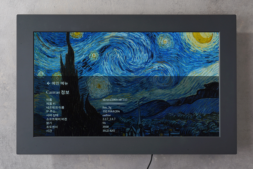 아래로 쓸어내리면 넷기어 뮤럴 MC315 디지털 액자를 제어할 수 있는 메뉴가 표시됩니다. 그리고 메뉴는 찾아보기와 WiFi 그리고 캔버스 정보가 자세히로 구성되어 있습니다.