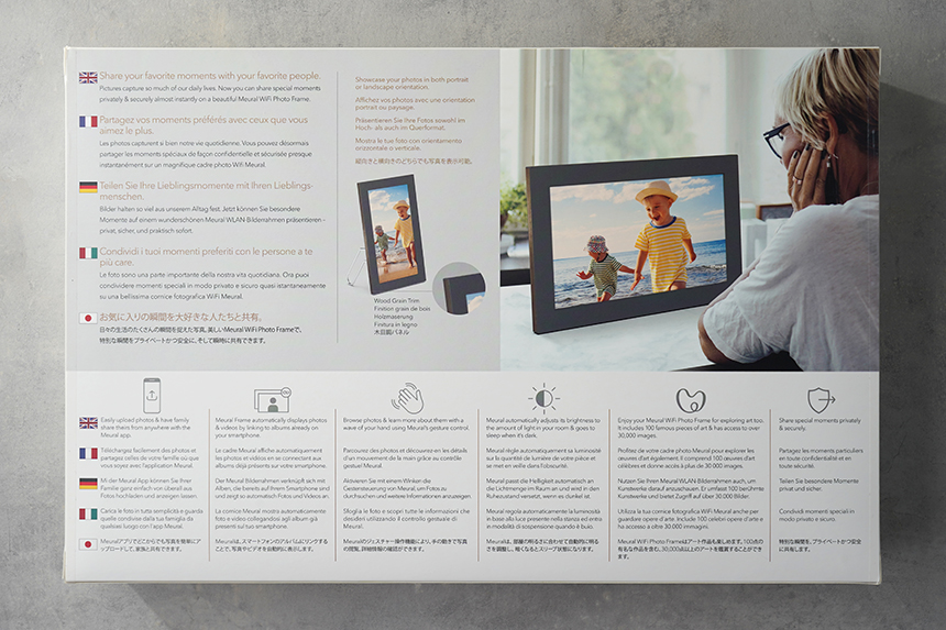 박스의 뒷면을 살펴보면 넷기어 뮤럴 MC315 디지털 액자의 핵심 기능이 설명되어 있습니다. 주목할 만한 부분은 제스처, 주변 광, 방향 감지 3가지 정밀 센서가 내장되어 있어서 편리하게 활용할 수 있다는 점입니다.