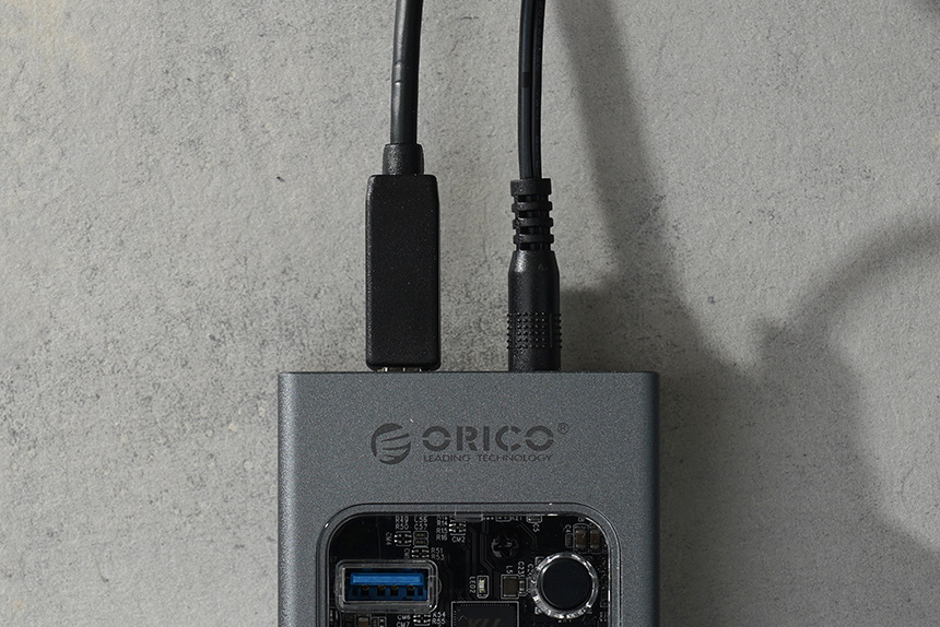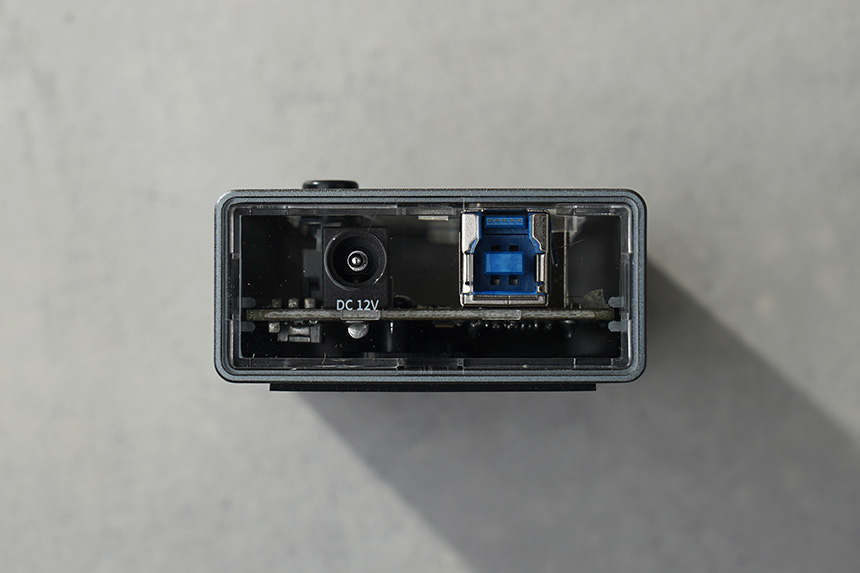 옆면을 살펴보면 DC 12V 전원을 입력받을 수 있는 단자와 함께 USB 3.0 타입 B 플러그가 배치되어 있습니다. USB 커넥터는 외장 하드 등에서 많이 사용되고 있습니다.