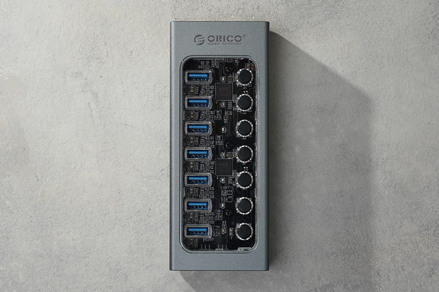 오리코 AT2U3-7AB USB 3.0 유전원 허브은 알루미늄과 투명한 PC 소재로 제작되었는데요. 디자인적인 부분에서는 완성도가 상당히 높은 편이라고 생각되었습니다.