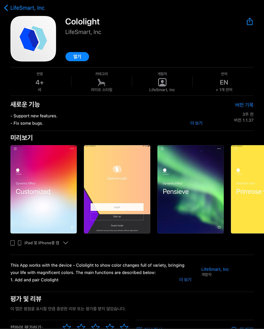 LifeSmart LED Quantum Light를 사용하기 위해서는 전용 앱을 설치해야 합니다. 샤오미 MI HOME이나 YEELIGHT 앱처럼 같은 기능을 하는 두 개의 앱으로 나누어져 있습니다. 저는 Cololight로 초기 설정을 진행했고 구글 어시스턴트와 연동하기 위해서는 LifeSmart라는 앱이 필요합니다. 회원가입도 해야 합니다.