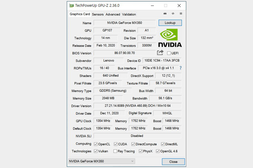 외장 그래픽카드는 엔비디아 지포스 MX350 2GB가 탑재되었습니다. 내장 그래픽카드와 비교해서 속도가 빠르고 게임도 어느 정도 플레이할 수 있습니다.