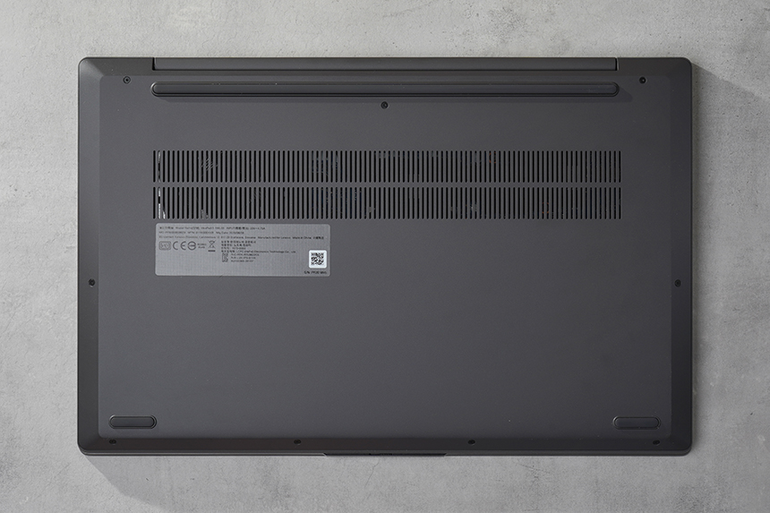 바닥을 살펴보면 위아래에 고무 지지대가 배치되어 있어서 잘 미끄러지지 않는 편입니다. 그리고 위쪽에는 발열을 줄여주기 위한 통풍구들이 준비되어 있습니다. 외장 그래픽카드 탑재 노트북이라서 일반적인 슬림 노트북과 비교하면 열기가 조금 더 발생할 수 있습니다.