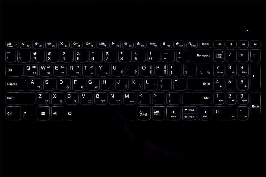 키보드에는 밝기를 조절할 수 있는 화이트 컬러의 백라이트가 탑재되었습니다. 그래서 야간에도 작업을 하거나 게임을 플레이할 수 있습니다. 일부 저가형 노트북과 차별화된 특징입니다.