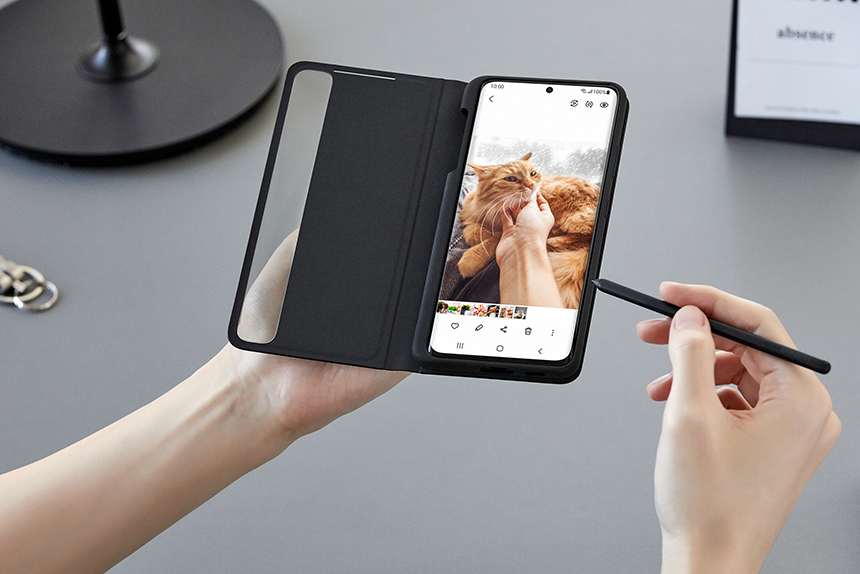 가장 먼저 살펴볼 커버는 삼성 갤럭시 S21 울트라 전용으로 출시된 스마트 클리어 뷰 커버 with S펜입니다. 참고로 울트라 버전은 S펜을 지원하지만 수납할 공간이 스마트폰 내부에 존재하지 않기 때문에 케이스에 탑재를 했습니다.