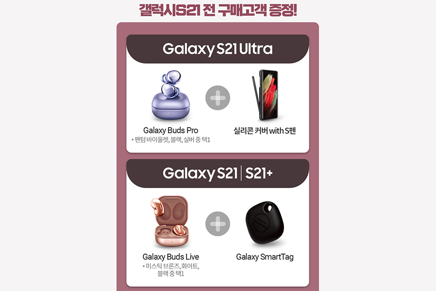 삼성전자에서도 갤럭시 S21 울트라 구매 고객에게는 갤럭시 버즈 프로와 실리콘 커버 With S펜 케이스를 S21이나 S21 플러그를 구입한 분들에게는 갤럭시 버즈 라이브와 갤럭시 스마트태그가 제공됩니다. 최신 스마트폰은 사전예약 때 구매하는 것이 가장 저렴한 것 같습니다.