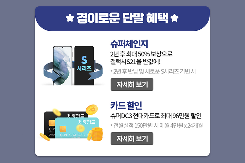 KT에서 준비한 다른 혜택을 살펴보면 우선 슈처체인지에 가입하면 2년을 사용하고 최대 50%를 보상받을 수 있습니다. 그리고 슈퍼 DC3 현대카드 할인 혜택도 제공하고 있습니다. 조건이 맞는다면 상당한 수준의 할인을 받을 수 있습니다.