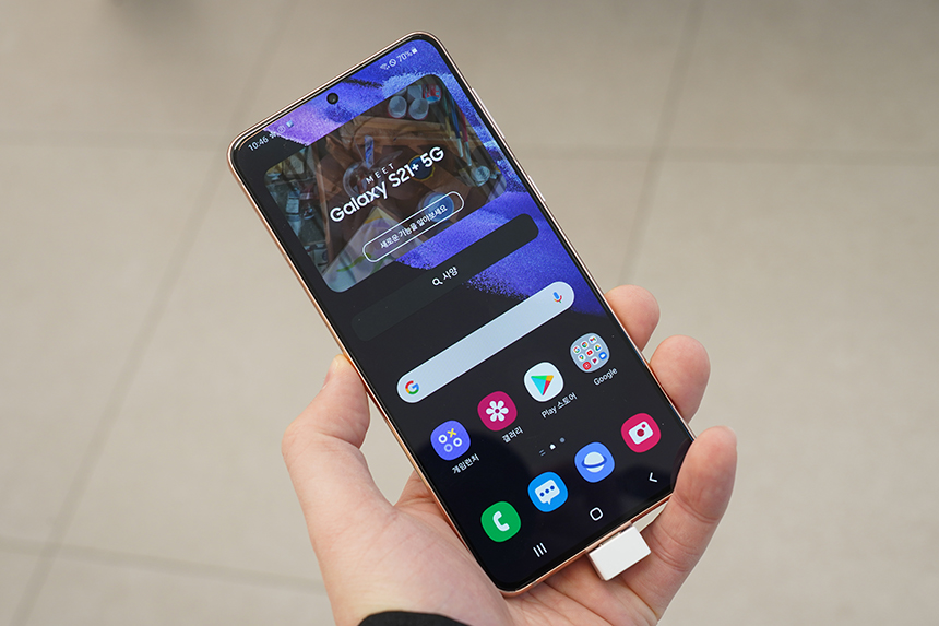 갤럭시 S21 플러스는 갤럭시 S21과 같은 120Hz를 지원하는 인피니티-O 디스플레이가 탑재되었지만 크기가 6.7인치로 약간 큰 편입니다. 한 손으로 사용하기에 크게 불편한 수준은 아니라고 판단되었습니다.