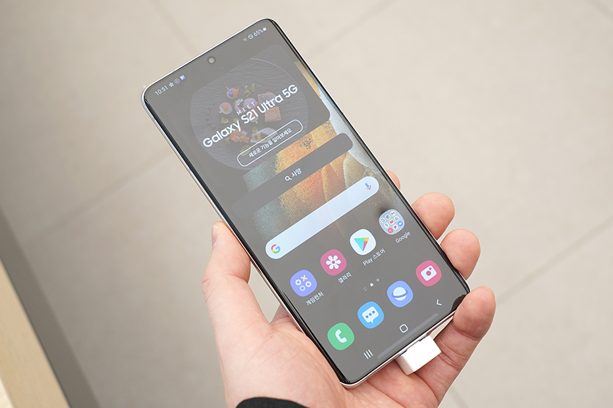 갤럭시 S21 울트라의 두께는 8.9mm로 크기를 생각하면 슬림한 편이고 무게는 227g으로 약간 묵직합니다. 대화면 디스플레이가 주는 압도적인 몰입감이 있기는 하지만 무게와 크기는 어느 정도 타협해야 할 것 같습니다.