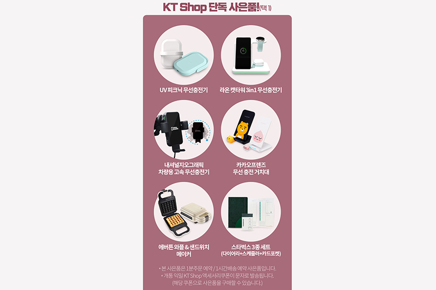 그리고 KT 샵에서는 UV피크닉 무선충전기나 라온 캣타워 3in1 무선충전기 그리고 내셔널지오그래픽 차량용 고속 무선충전기, 카카오프렌즈 무선 충전 거치대, 에버튼 와플&샌드위치 메이커, 스타벅스 3종 세트 중에서 하나의 사은품을 받을 수 있습니다.