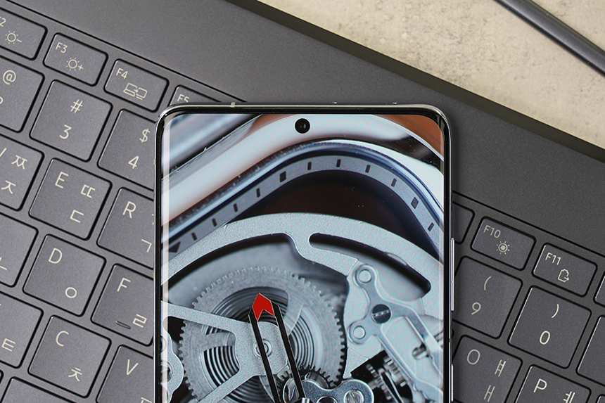 디스플레이의 상단에는 일명 펀치홀 형태의 4,000만 화소 셀피 카메라가 탑재되었습니다. 카메라 홀의 크기가 콤팩트한 편이어서 동영상을 감상하거나 게임을 플레이할 때 크게 거슬리지 않았습니다. 그리고 얼굴 인식을 통한 잠금 해제 기능도 지원합니다.