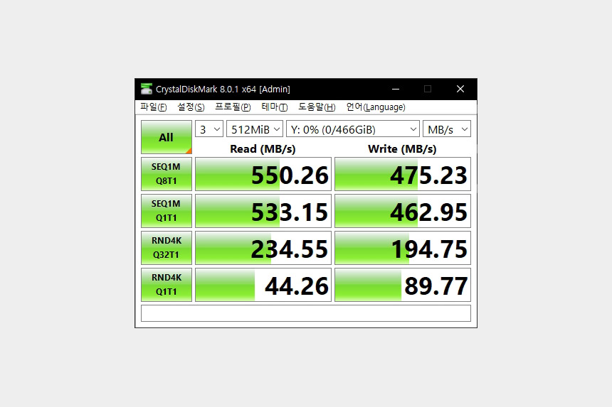 마이크론 Crucial MX500 500GB의 속도를 확인해 보면 읽기는 550MB/s 쓰기는 475MB/s가 측정되었습니다. 그리고 디램도 내장되었는데요. 250GB는 250MB, 500GB는 500MB, 1TB는 1GB가 탑재되었습니다. DRAM이 없는 SSD는 가능하면 구매하지 않는 것이 좋습니다.