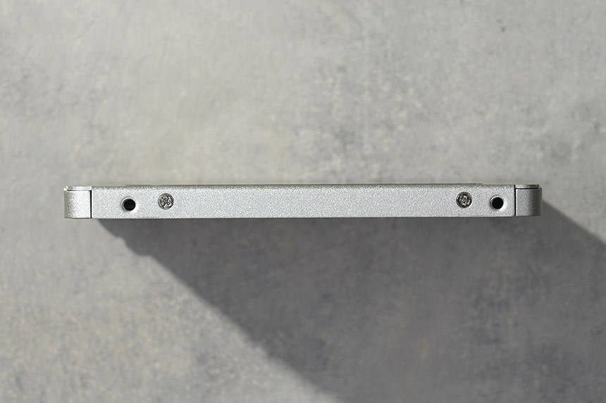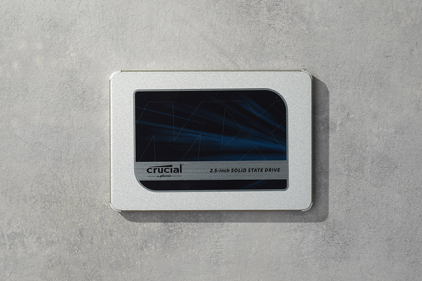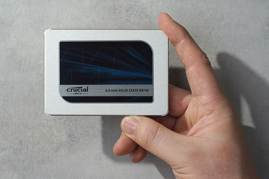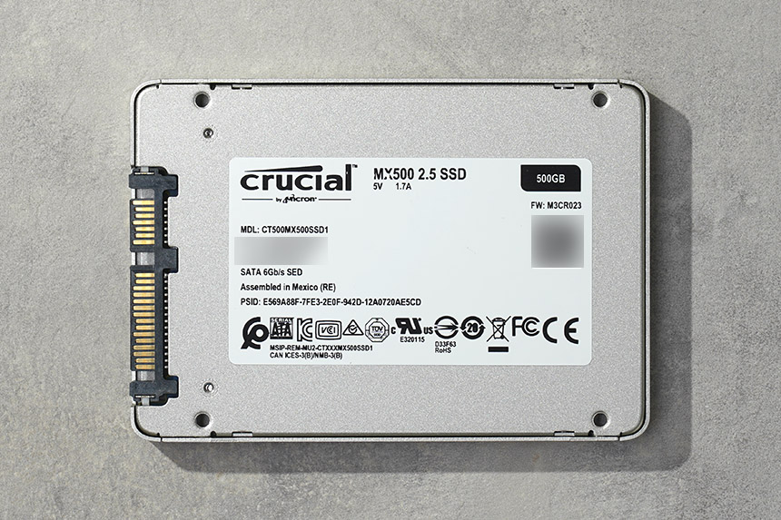 마이크론 Crucial MX500 500GB의 바디는 메탈로 제작되었고 겉면에는 2.5인치 폼팩터로 제작되었다는 문구가 표시되어 있습니다. 전체적으로 단단한 느낌을 주는 편이고 하드디스크처럼 물리적으로 동작하는 모터가 없어서 노트북과 같은 충격이 발생할 수 있는 제품에서도 안정적으로 활용할 수 있습니다.