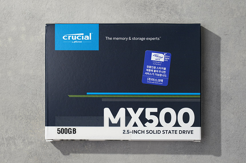 마이크론 Crucial MX500 500GB의 박스는 깔끔한 형태로 디자인되었고 아래쪽에는 용량이 표시되어 있습니다. 참고로 250GB, 500GB, 1TB, 2TB 제품이 판매되고 있고 1TB제품이 용량 대비 가격이 가장 저렴합니다. 그리고 수입사는 대원CTS와 아스크텍 중에서 선택할 수 있습니다.